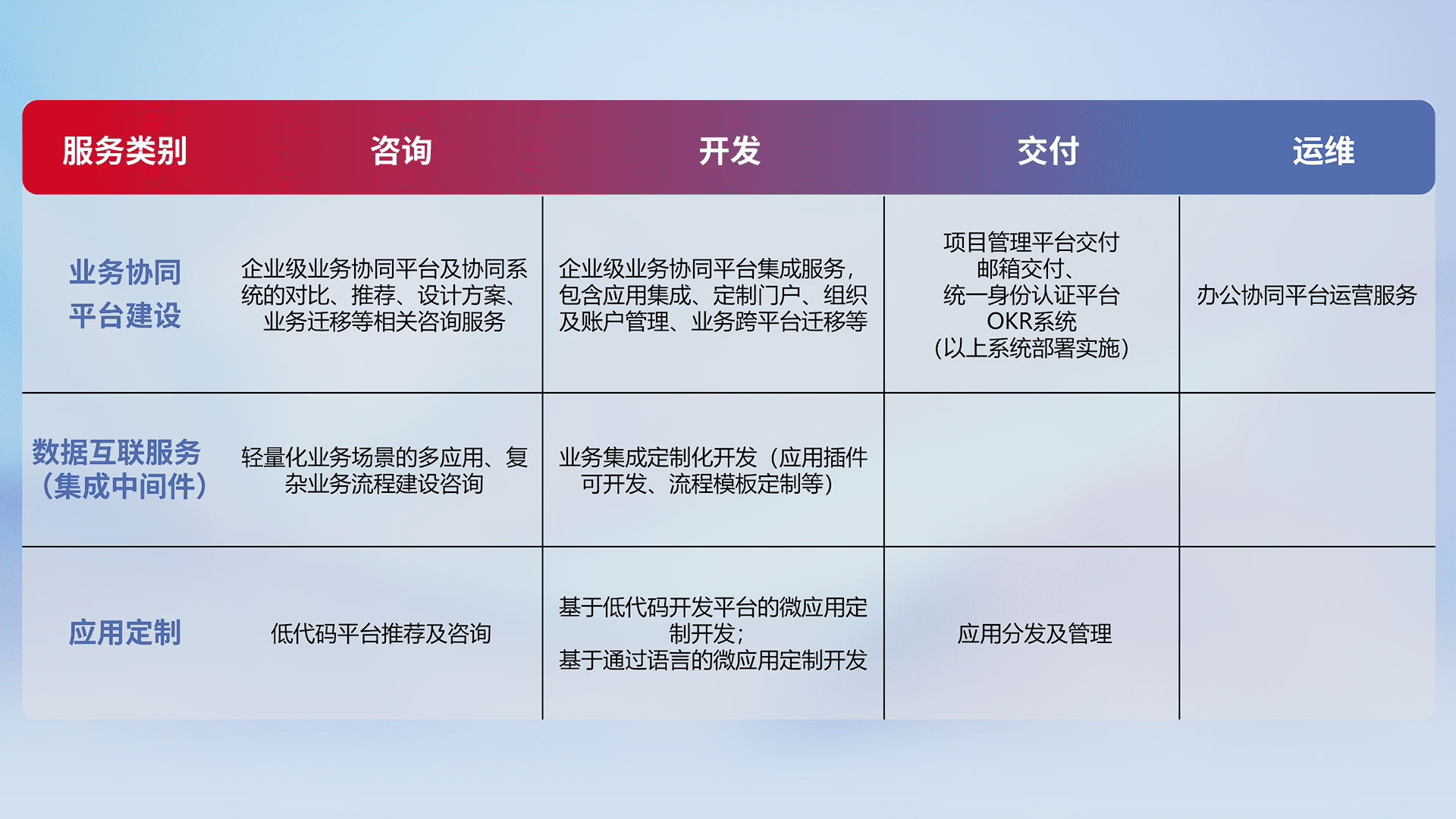针对钉钉、、企微、、、、IDaas等平台级产品提供产品的规划、、、方案、、交付、、、定制化开发等服务,,,实现如统一协同办公、、智能客户服务、、、混合会议管理、、、智能数据查询、、、、等业务场景,,实现数字化转型。。。。
